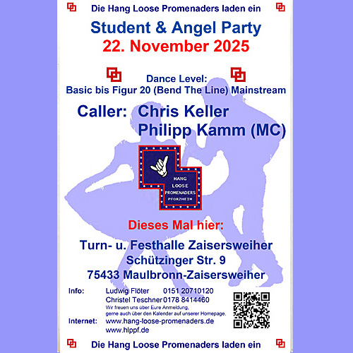 | 22.11.2025 | ![]() Student & Angel Party 2025 Caller: Chris Keller, Philipp Kamm (MC) Ort: Turn- u. Festhalle Zaisersweiher Anzahl GĂ€ste: 43 Anzahl Vereine: 12 |